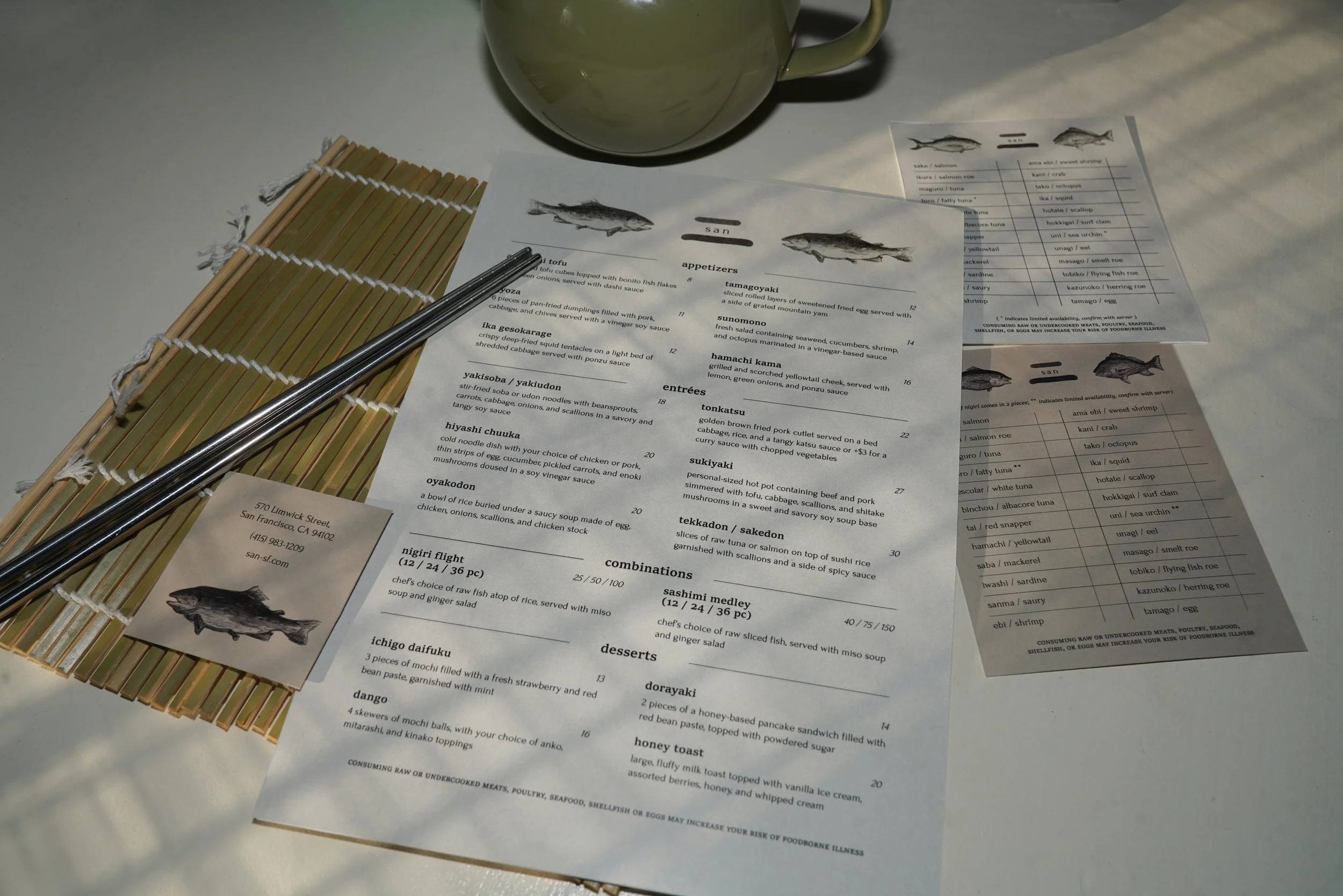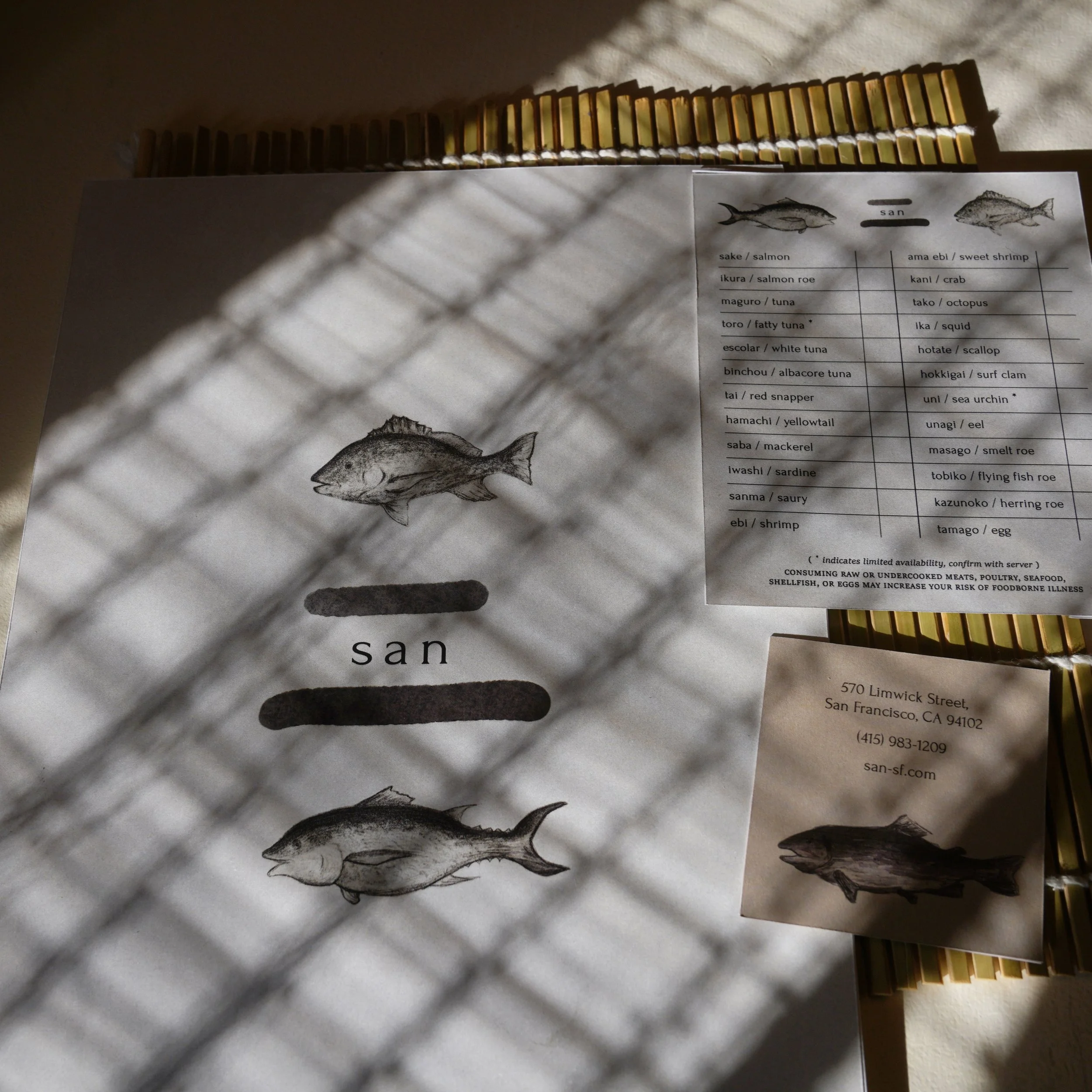 Menus and such for a high-end Japanese restaurant, named San.